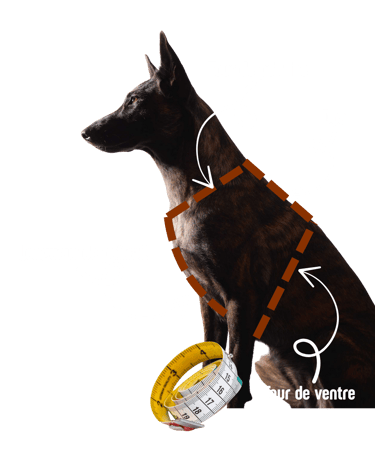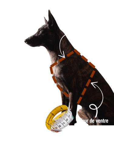 Mesurez le tour de poitrail juste derrière les pattes avant (pour les harnais).